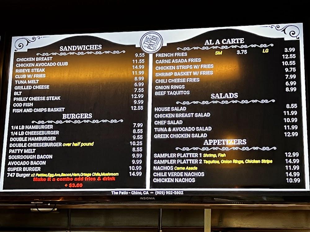 The menu at The Patio Grill & Cantina features an enticing mix of traditional Mexican and American dishes. Breakfast options include hearty favorites like chilaquiles and breakfast burritos. Lunch and dinner menus present burgers, sandwiches, and delectable Mexican plates. Don't miss the fan-favorite 747 burger loaded with toppings.